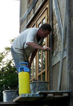 Damit die Feuchtigkeit vom Putz nicht sofort von der durchgetrockneten Lehmwand aufgesogen wird, mußte ich diese vorher ausgiebig befeuchten, um so ein langsames Trocknen des Putzes zu gewährleisten.